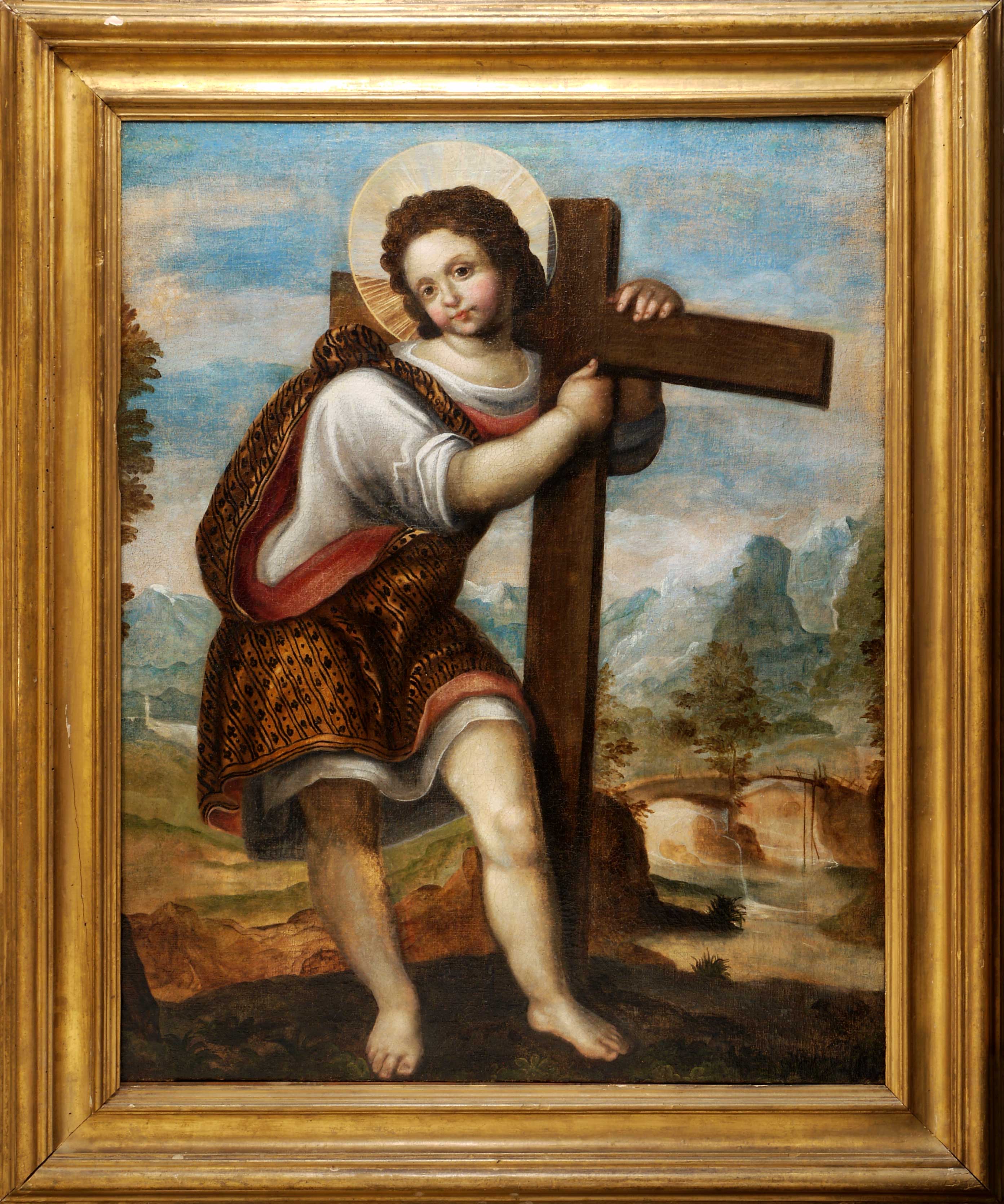 | Marco d'Oggiono Lombard School (Modern Day Italy), circa 1475 - 1549 "San Giovannino before a Mountainous Landscape" Oil on Lined Canvas, measures 36.75" x 29.75" |