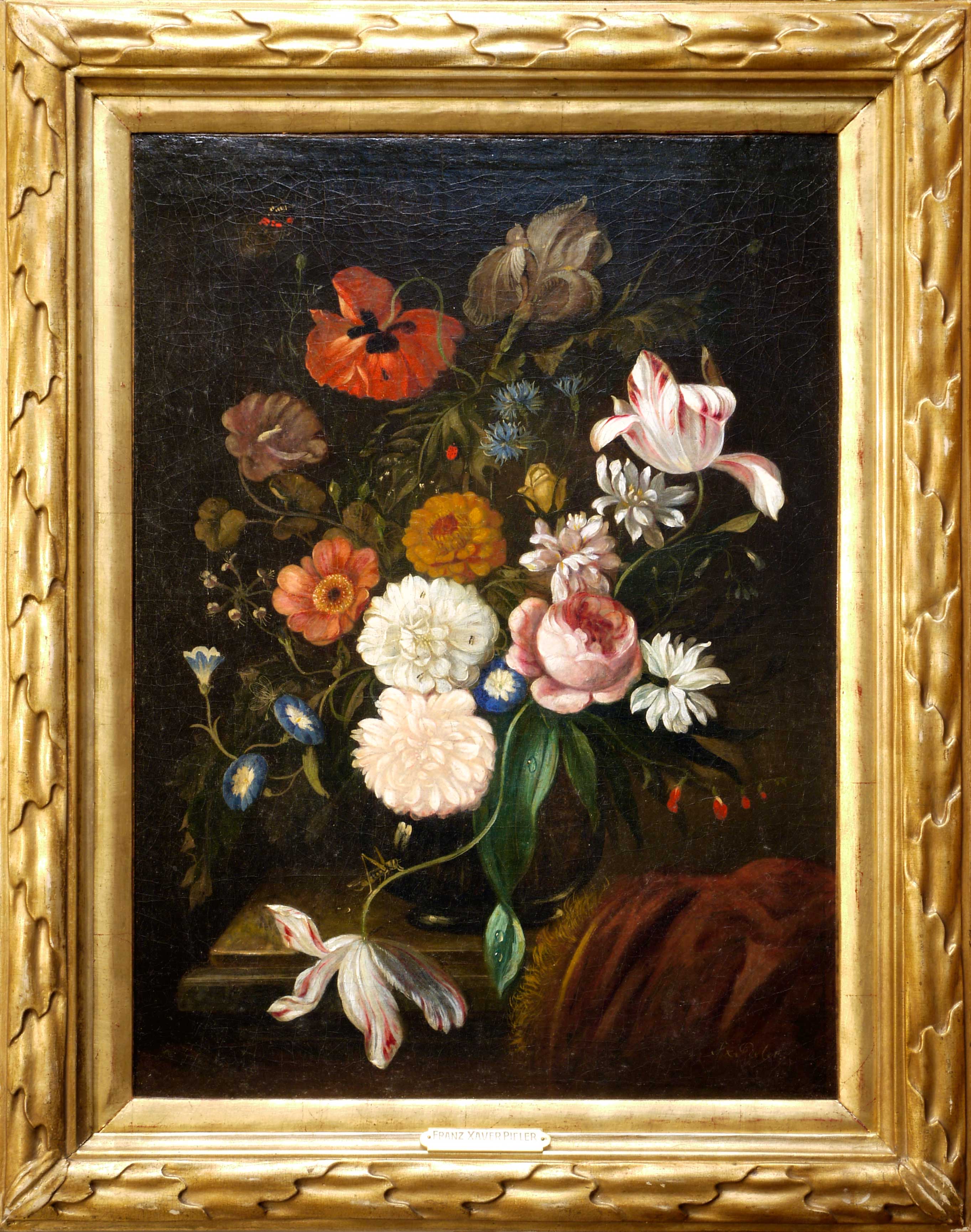 | Franz Xaver Peiler Austrian, 1879 - 1952 "Still Life of Flowers in a Glass Vase on a Marble Plinth" Oil on Lined Canvas measures 19.5" x 14.5"- Signed lower right Housed in a fine hand carved gilt frame |