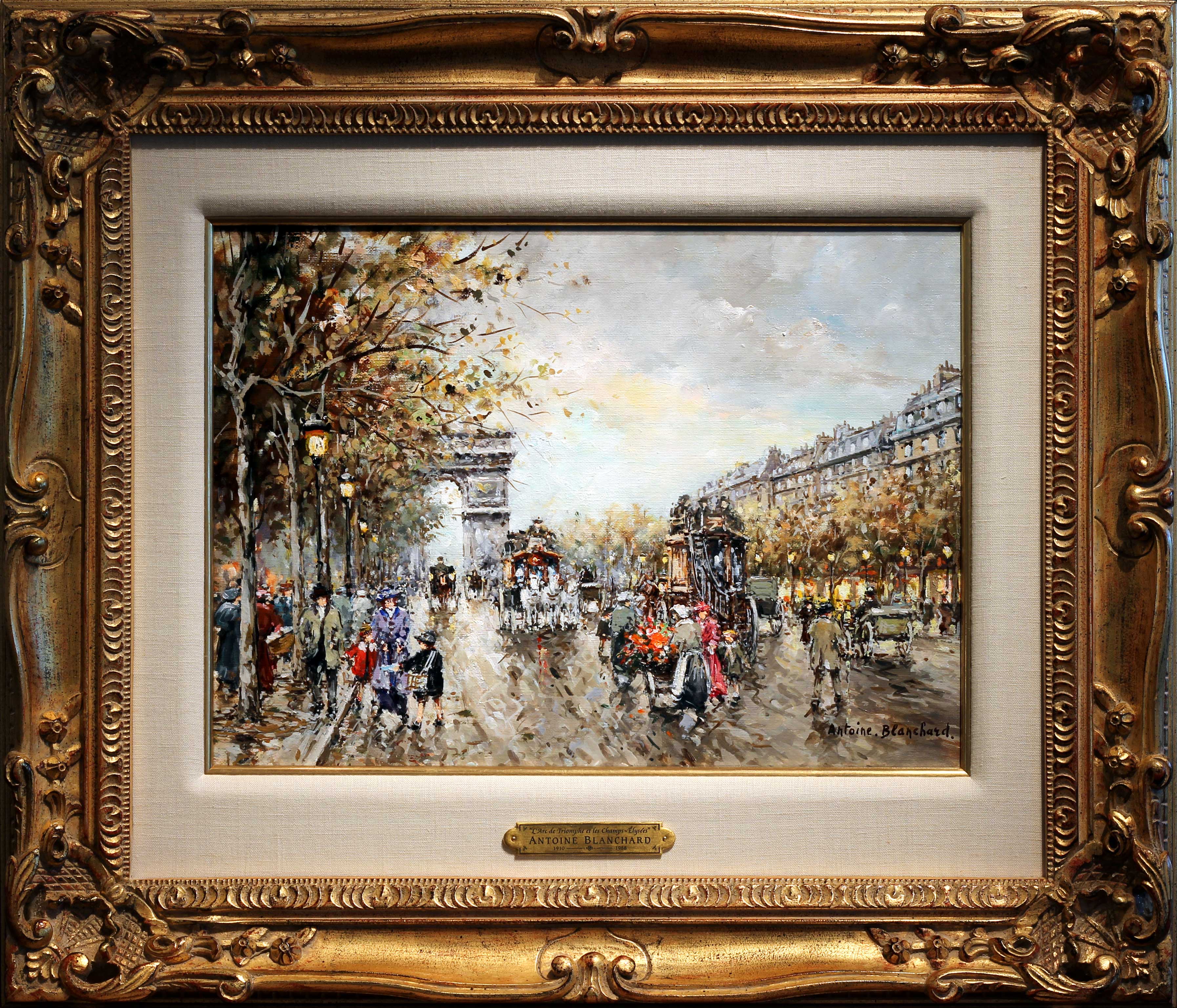 | Antoine Blanchard French, 1910 - 1988 "L'Arc de Triomphe et les Champs Élysées" Oil on Canvas, measures 13" x 18" - Signed Lower Right Titled and inscribed to canvas on verso. Artist stamp and inventory number to verso. Initialed and stamped by Paul(ette) Larde, expert on the artist, to verso |