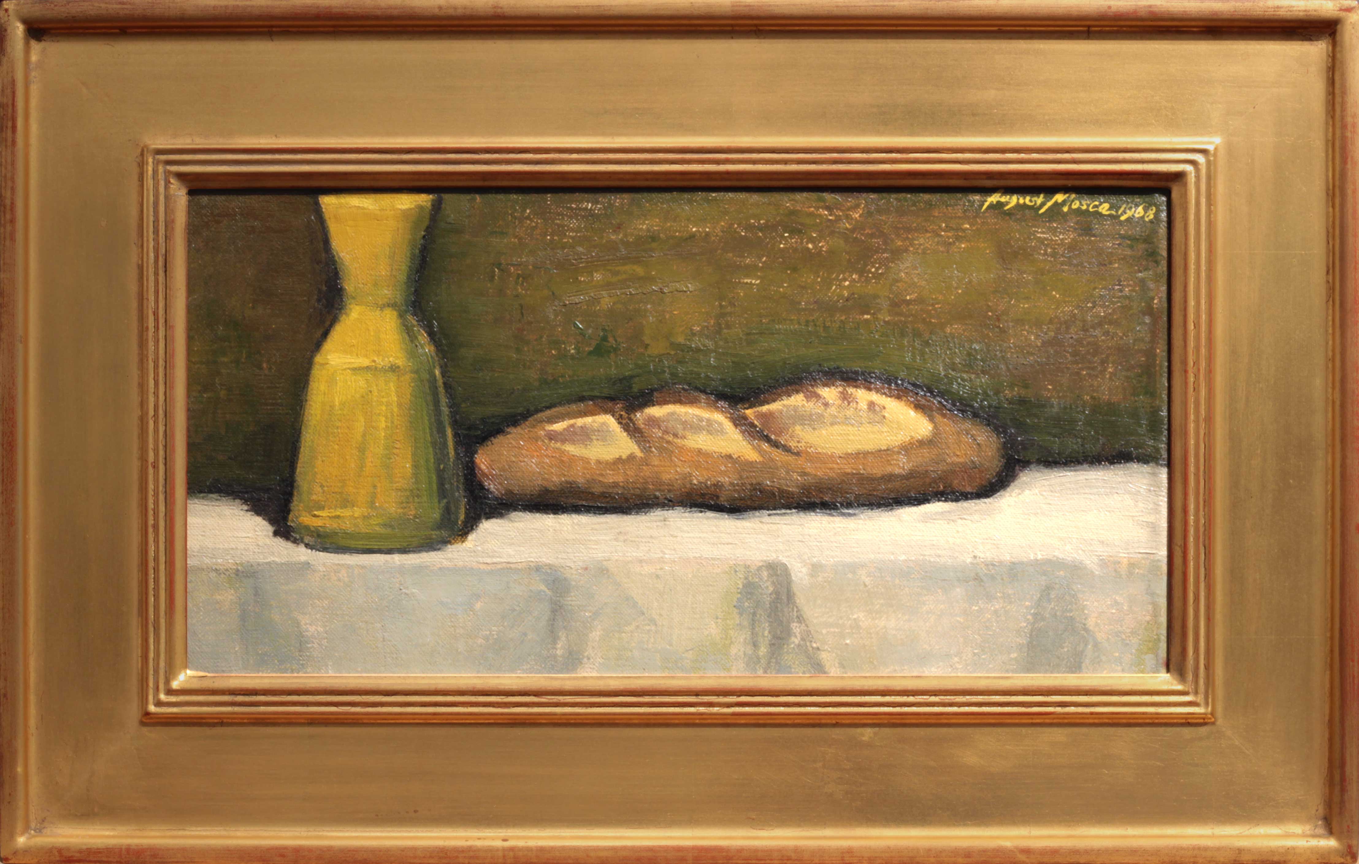 | August Mosca Italian/American, 1909 - 2002 "Pane e Vino" Oil on Canvas laid to panel measures 8" x 16" Signed and dated 1969 upper right |