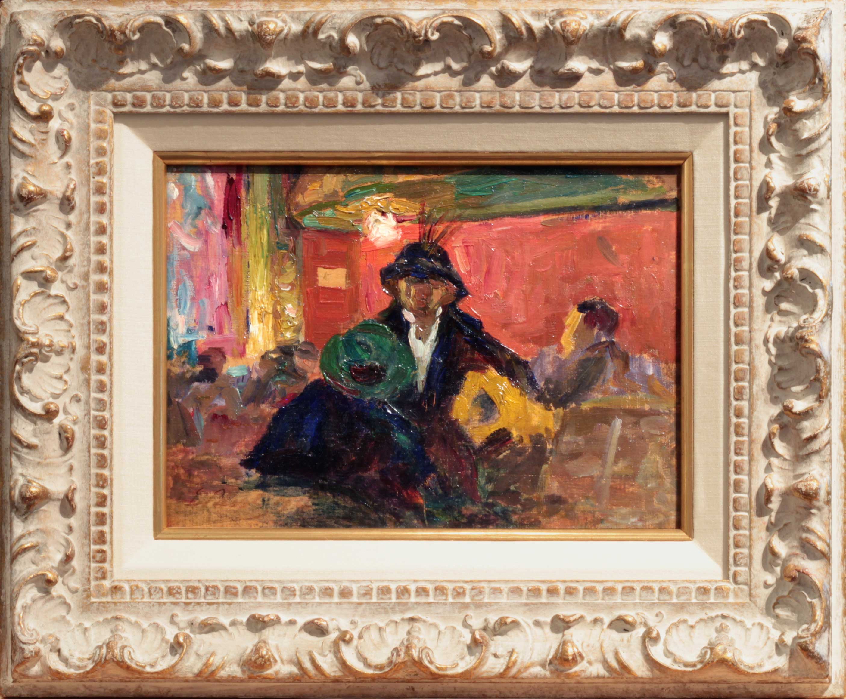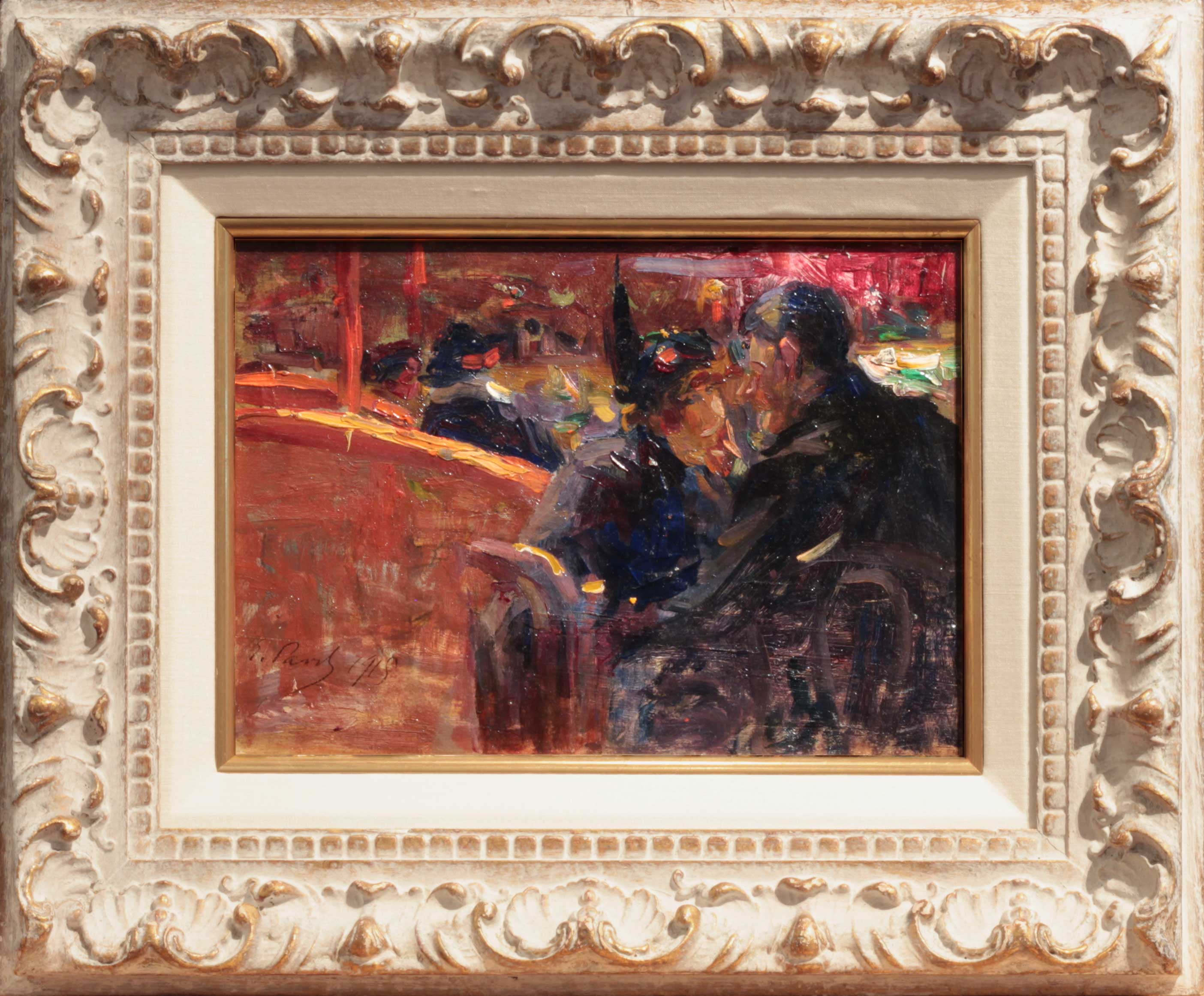| Elie Anatole Pavil Ukraine / France, 1873 - 1948 "Café au Montmartre ~ Paris" Oil on panel measures 6.25" x 8.7" (15.6 cm x 22.1 cm) Signed lower center and dated 1908 Titled and Inscribed to Verso |