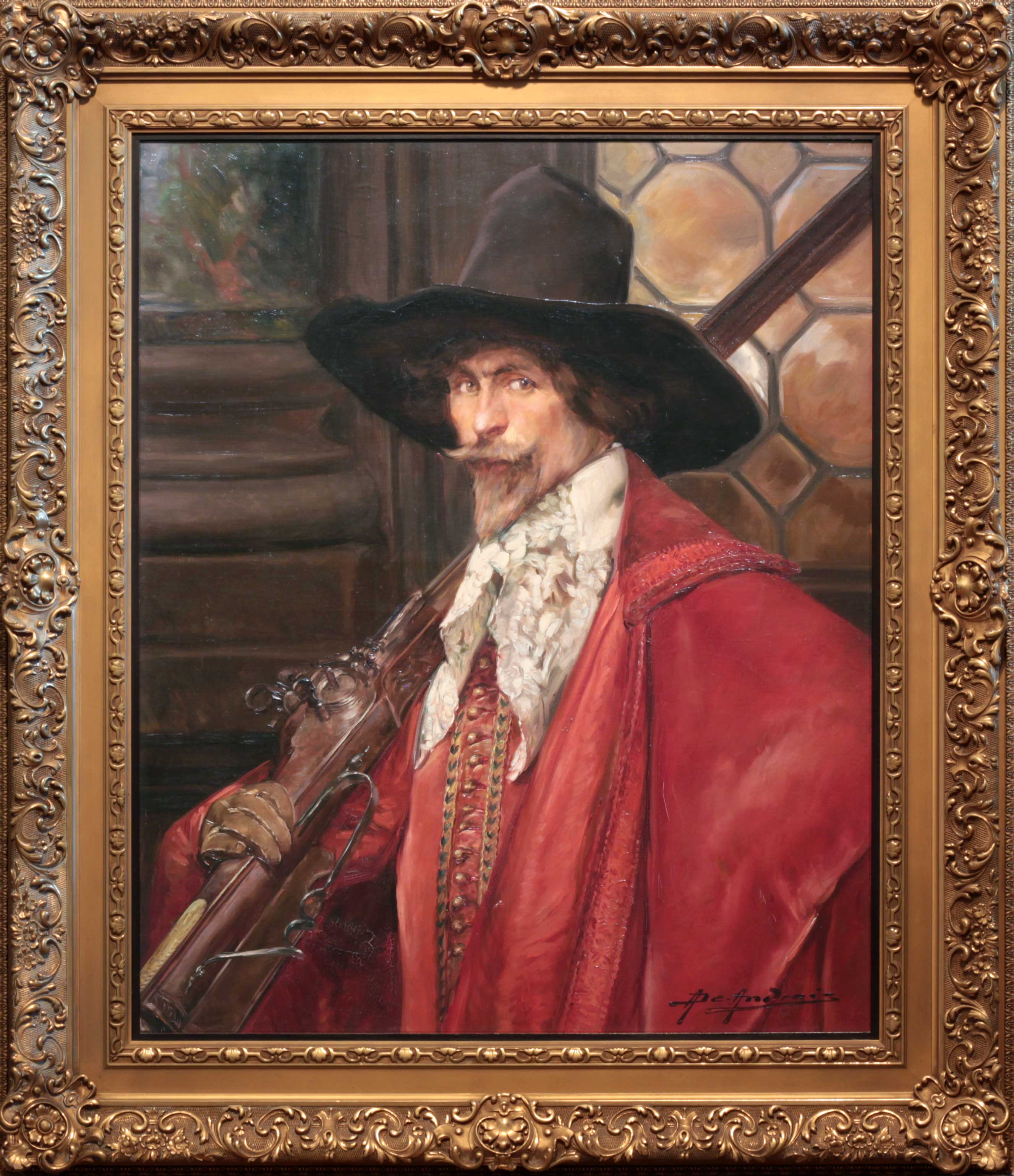 | Alex De Andreis Dutch, 1880 - 1929 "Cavalier in an Interior Holding a Musket" Oil on stretched canvas measures 31.75 X 26.25" (80.5 cm x 66.5 cm) ~ signed lower right |