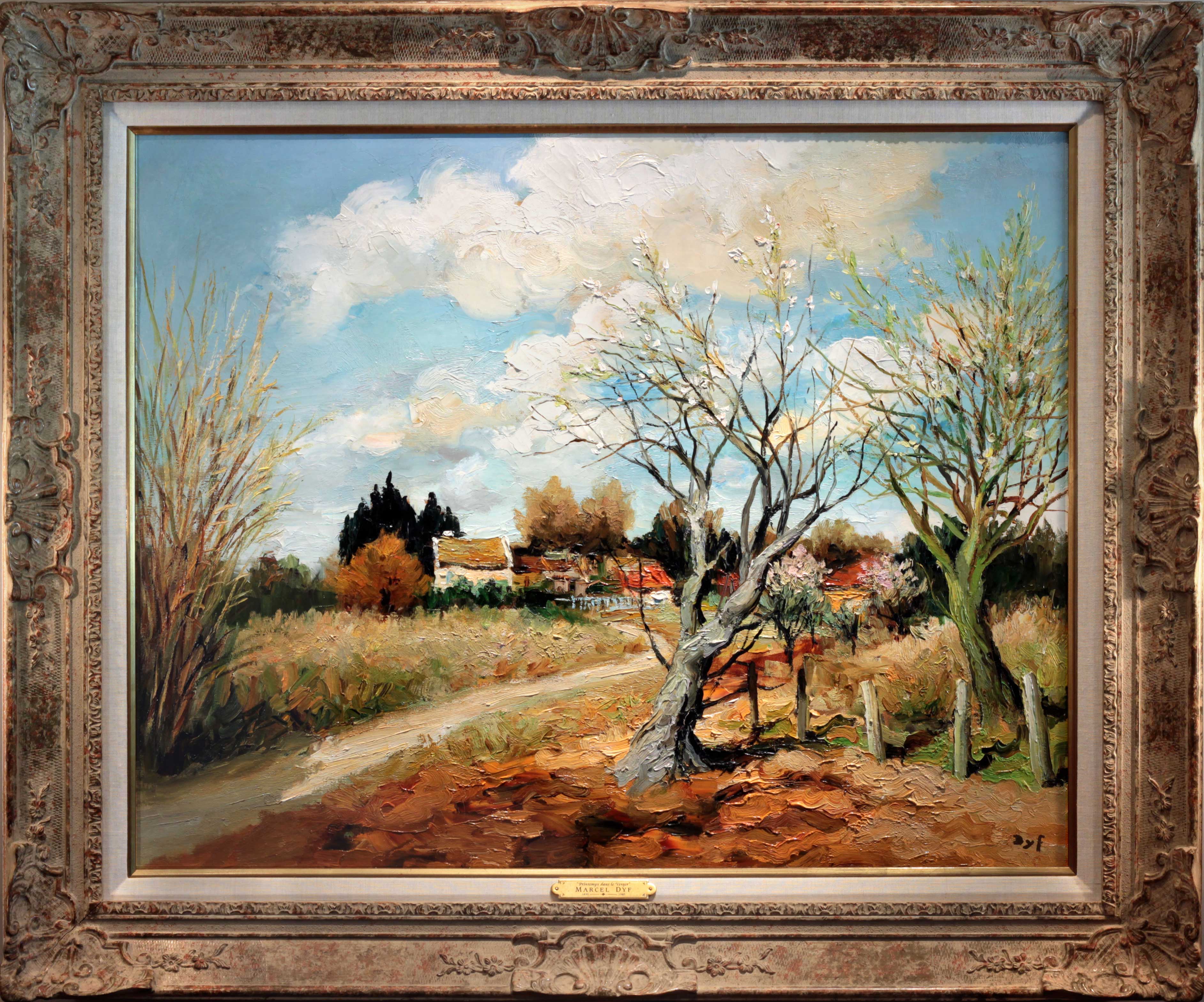 | Marcel Dyf French, 1899 - 1985 "Printemps dans le Verger" Oil on lined canvas (Mylar® Chiffon/BEVA-371) 28.75" x 36.25" (73 cm x 93 cm) Signed lower right - The original frame is retained with a replaced liner |