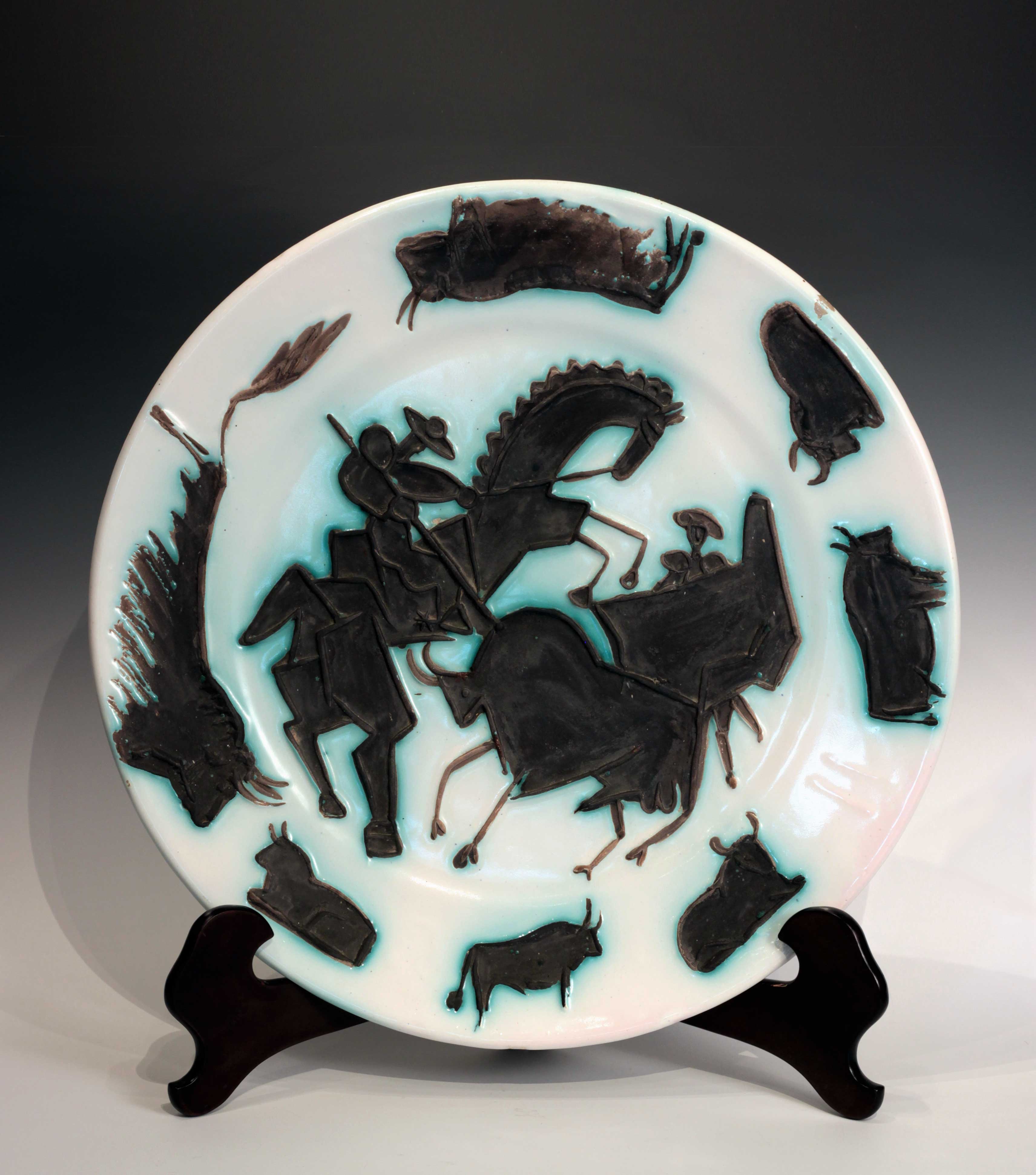 | Pablo Picasso Spain/France, 1881 - 1973 "Corrida ~1953" Madoura ceramic round platter of white Terre de Faïance earthenware with black oxide and glaze Measures 17.1" (43.4 cm) diameter. An especially fine example conceived on March 11, 1953 and executed in an edition of 200 Stamped 'Madoura Plein Feu / Empreinte Originale de Picasso' on verso - Ref. AR (Ramié) 181 |
