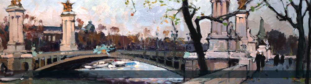 | Constantin Kluge Russia/France, 1912 - 2003 "Evening in Paris ~ Le Pont Alexander III" Oil on Canvas measures 25.7" x 36.2" (65.3 cm x 92 cm) Signed lower right - Findlay Galleries tag encapsulated to verso |